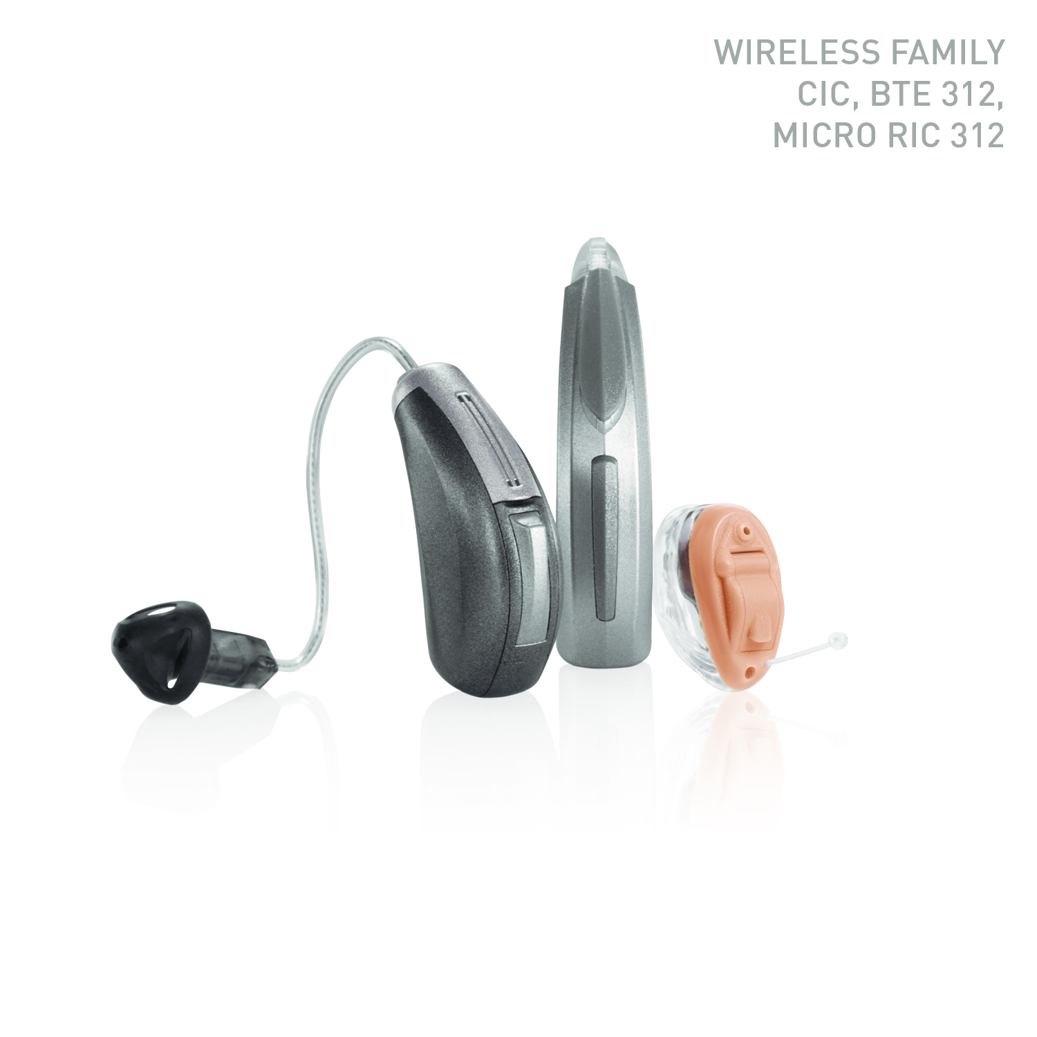 Three styles of hearing aids displayed.